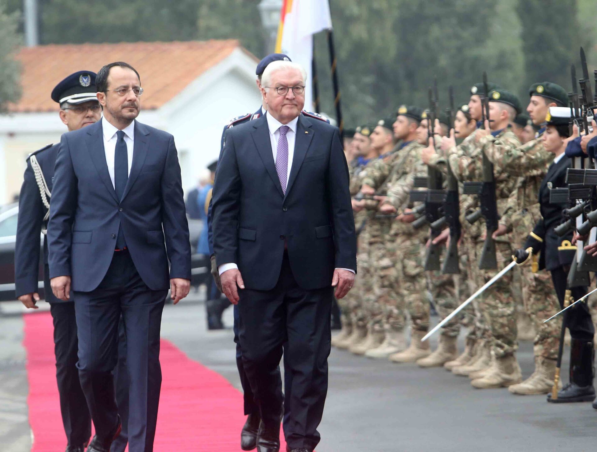 Almanya Cumhurbaşkanı Frank-Walter Steinmeier , bu sabah Kıbrıslı mevkidaşı Nikos Hristodoulidis tarafından başkanlık sarayında karşılandı.