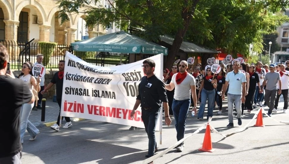 Kararın açıklanması üzerine, “Direne Direne Kazanacağız”, “Kıbrıs Laiktir, Laik Kalacak” ve “Bağımsız Yargı, Güvenli Gelecek” sloganları atıldı.