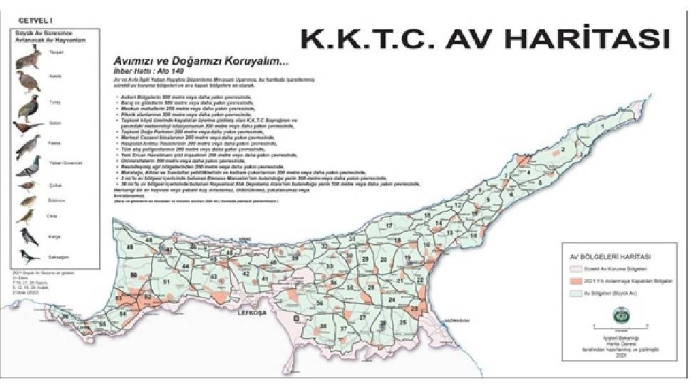 Büyük Av Haritasında işaretlenmiş sürekli av koruma bölgeleri ve ava kapalı bölgelere ek olarak; Baraj ve göletlerin 500 metre, Meskun mahallerin 250 metre, Piknik alanlarının 300 metre, Taşkent köyü üzerinde kayalıklara çizilmiş KKTC bayrağının 200 metre, Taşkent Doğa Parkının 200 metre, Merkezi cezaevi binalarının 200 metre, Haspolat arıtma tesislerinin 200 metre, Tüm atış poligonlarının 200 metre, Yeni Ercan havalimanı pist inşaatının 200 metre, Üniversitelerin 200 metre, Resmileşmiş ağıl bölgelerinin 200 metre, Muratağa, Atlılar ve Sandallar şehitliklerinin ve katliam çukurlarının 200 metre, 2 nolu av bölgesindeki Eleoussa Manastırının 300 metre veya daha yakın çevresinde herhangi bir av hayvanı veya yabani kuş avlanamaz, öldürülemez, yakalanamaz veya kovalanamaz.