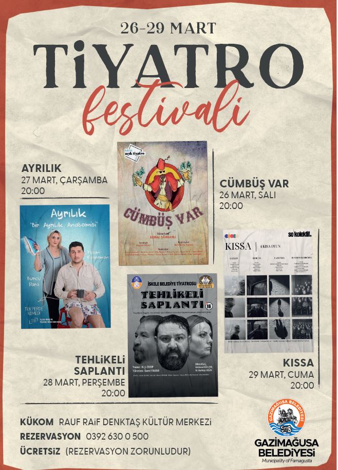 Gazimağusa Belediyesi (GMB), 27 Mart Dünya Tiyatro Günü dolayısıyla ülkedeki tiyatro gruplarının sahneleyeceği oyunlardan oluşan bir tiyatro festivali düzenliyor.
