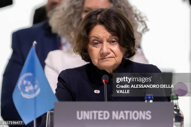 Rosemary DiCarlo Under-Secretary-General for Political and Peacebuilding Affairs of United Nations attends a plenary session during the Summit on peace in Ukraine, at the luxury Burgenstock resort, near Lucerne, on June 16, 2024. The two-day gathering brings together Ukrainian President and more than 50 other heads of state and government, to try to work out a way towards a peace process for Ukraine -- albeit without Russia. (Photo by ALESSANDRO DELLA VALLE / POOL / AFP) (Photo by ALESSANDRO DELLA VALLE/POOL/AFP via Getty Images)