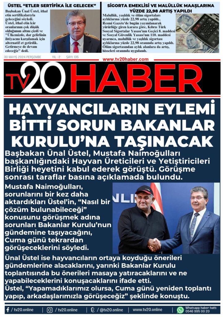 Başbakan Ünal Üstel, Mustafa Naimoğulları başkanlığındaki Hayvan Üreticileri ve Yetiştiricileri Birliği heyetini kabul ederek görüştü. Görüşme sonrası taraflar basına açıklamada bulundu.