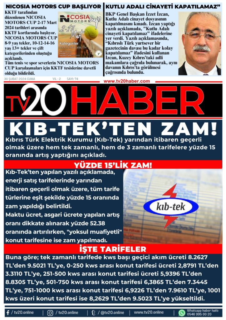 Kıbrıs Türk Elektrik Kurumu (Kıb-Tek) yarından itibaren geçerli olmak üzere hem tek zamanlı, hem de 3 zamanlı tarifelere yüzde 15 oranında artış yaptığını açıkladı.