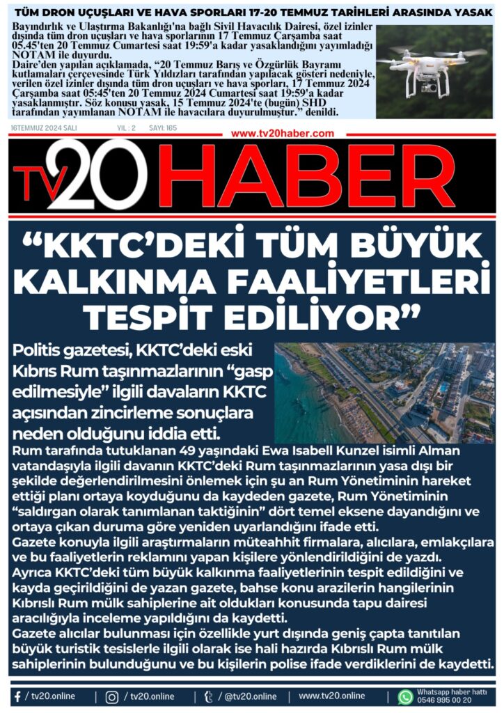 Ayrıca KKTC’deki tüm büyük kalkınma faaliyetlerinin tespit edildiğini ve kayda geçirildiğini de yazan gazete, bahse konu arazilerin hangilerinin Kıbrıslı Rum mülk sahiplerine ait oldukları konusunda tapu dairesi aracılığıyla inceleme yapıldığını da kaydetti.