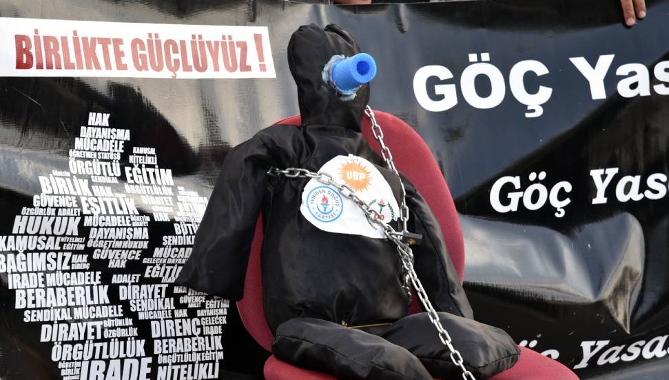 Eylemde, “Siz teslim oldunuz, biz teslim olmayacağız.”, “Göç Yasası’na dur de. Göç Yasası’nda buluşmak değil, Göç Yasası’ndan kurtulmak istiyoruz.”, “Öğretmenlere saldırı ve itibarsızlaştırma politikaları kabul edilemez.” pankartları açılırken; üzerinde “UBP, DP, YDP” logoları bulunan bir bebeğin zincirlendiği sandalye Başbakanlık bahçesine atıldı.