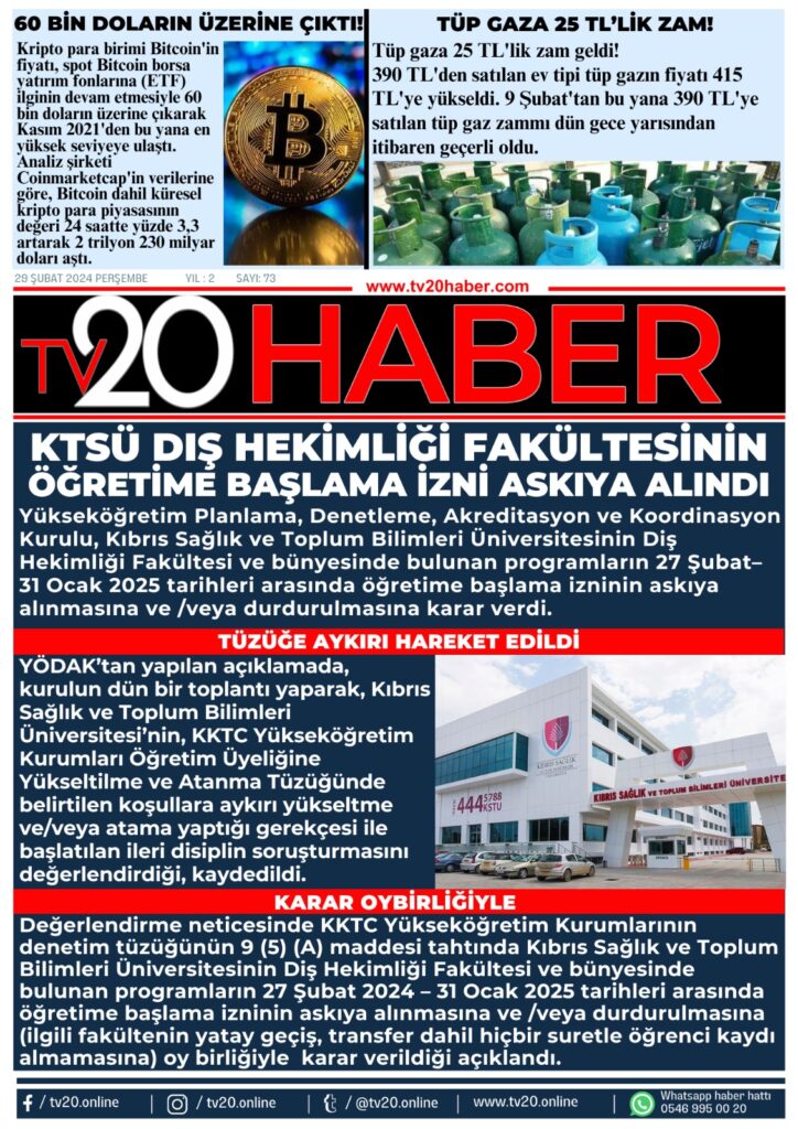 Yükseköğretim Planlama, Denetleme, Akreditasyon ve Koordinasyon Kurulu, Kıbrıs Sağlık ve Toplum Bilimleri Üniversitesinin Diş Hekimliği Fakültesi ve bünyesinde bulunan programların 27 Şubat– 31 Ocak 2025 tarihleri arasında öğretime başlama izninin askıya alınmasına ve /veya durdurulmasına karar verdi.