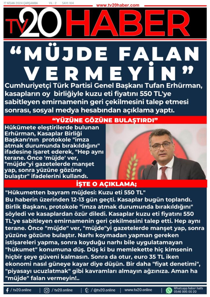 Cumhuriyetçi Türk Partisi Genel Başkanı Tufan Erhürman, kasapların oy birliğiyle kuzu eti fiyatını 550 TL’ye sabitleyen emirnamenin geri çekilmesini talep etmesi sonrası, sosyal medya hesabından açıklama yaptı.
