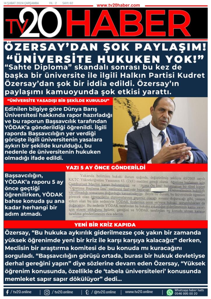 Dünya Barış Üniversitesi’de yetkili bazı isimlerin para karşılığı sahte diploma dağıtmasının ortaya çıkmasının ardından, bugün Halkın Partisi Genel Başkanı Kudret Özersay’ın sosyal medya üzerinden paylaşımıyla süreç yeni bir skandal ile çalkalandı.