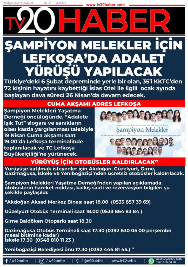 Şampiyon Melekleri Yaşatma Derneği öncülüğünde, “Adalete Işık Tut” sloganı ve sanıkların olası kastla yargılanması talebiyle 19 Nisan Cuma akşamı saat 19.00’da Lefkoşa terminalinde toplanılacak ve TC Lefkoşa Büyükelçiliği’ne yürünecek.