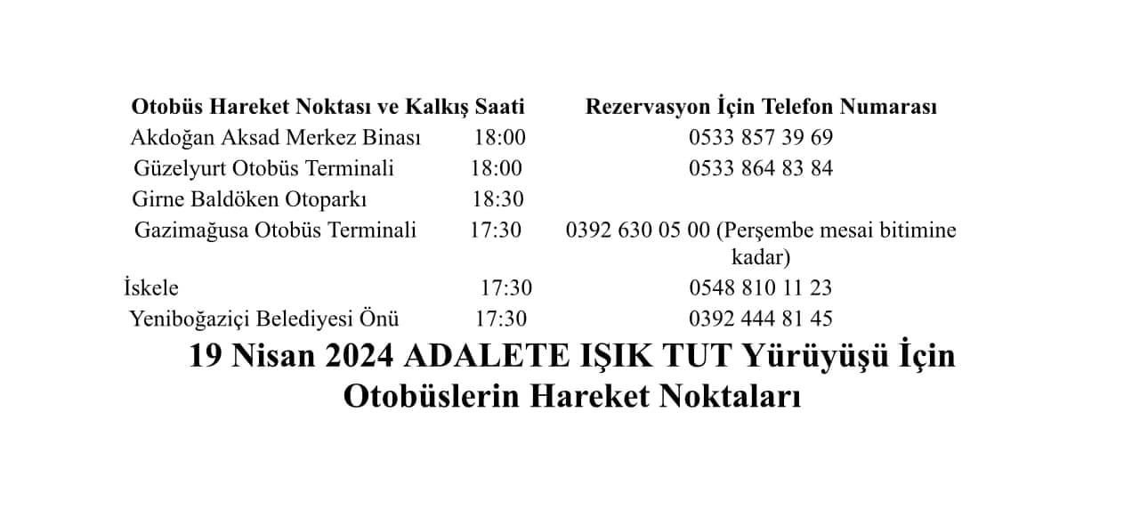 Yürüyüşe katılmak isteyenler için Akdoğan, Güzelyurt, Girne, Gazimağusa, İskele ve Yeniboğaziçi’nden ücretsiz otobüsler kaldırılacak.