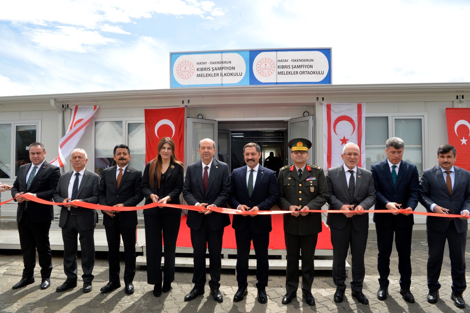 Cumhurbaşkanı Ersin Tatar, daha sonra Türkiye Cumhuriyeti Milli Eğitim Bakanlığı tarafından konteynerden yapılan ve tek çatı altındaki “Hatay-İskenderun Kıbrıs Şampiyon Melekler İlkokulu” ile “Hatay-İskenderun Kıbrıs Şampiyon Melekler Ortaokulu”nun açılışını yaptı.