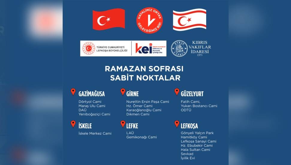 Türkiye Cumhuriyeti Lefkoşa Büyükelçiliği Kalkınma ve Ekonomik İşbirliği (KEİ) Ofisi, Kıbrıs Vakıflar İdaresi iş birliğiyle Ramazan ayı boyunca iftar yemeği verecek.