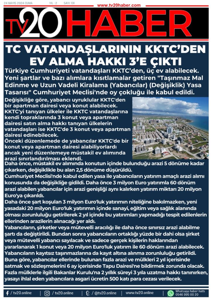 Cumhuriyet Meclisi’nde kabul edilen yasa ile yabancıların yatırım amaçlı arazi alımı konusunda da değişikliğe gidildi. Daha önce 3 milyon Euro yatırımla 60 dönüm arazi alabilen yabancılar için arazi genişliği aynı kalırken yatırım miktarı 20 milyon Euro’ya çıkarıldı.